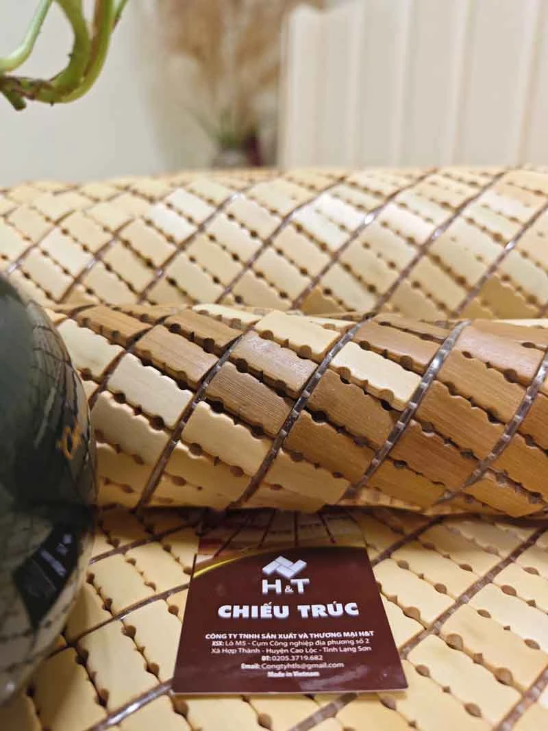 Chiếu trúc được làm từ những cây tre tự nhiên trên 5 năm tuổi, được chọn lọc kỹ càng từ vùng núi Tây Bắc. Nhờ quy trình xử lý carbon ở nhiệt độ cao, mắt chiếu trở nên mịn màng, không gờ, giúp chống lại nấm mốc và sâu mọt, đảm bảo độ bền cao.